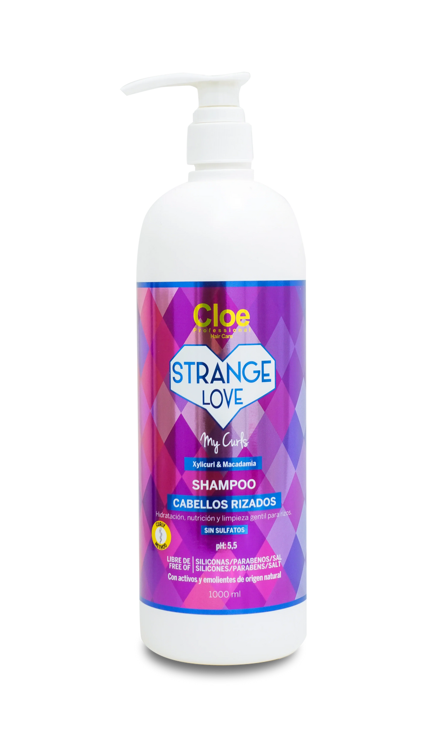 SHAMPOO STRANGE LOVE, hidratante y nutritivo para el cuidado y mantención del cabello rizado, que brinda una limpieza gentil y efectiva en el cuero cabelludo.